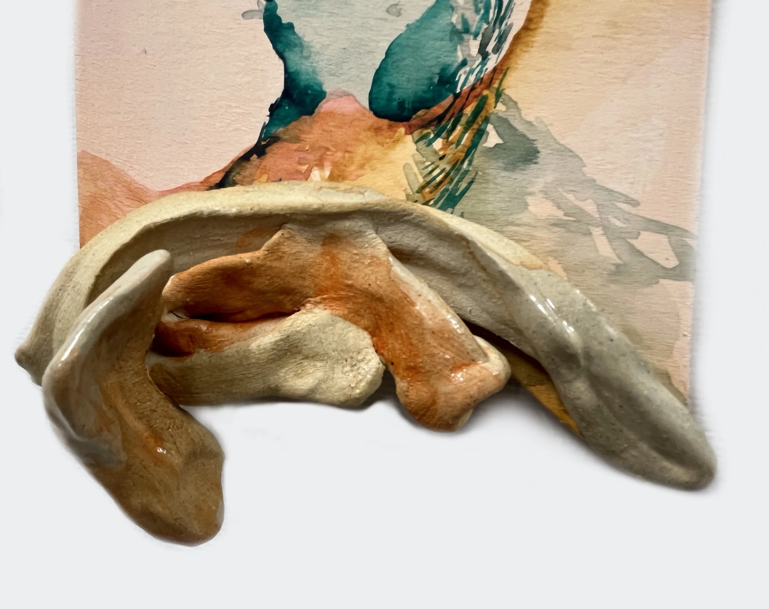 Can’t bury it | 2024 | ceramic and watercolour on wood panel | 6”x6”