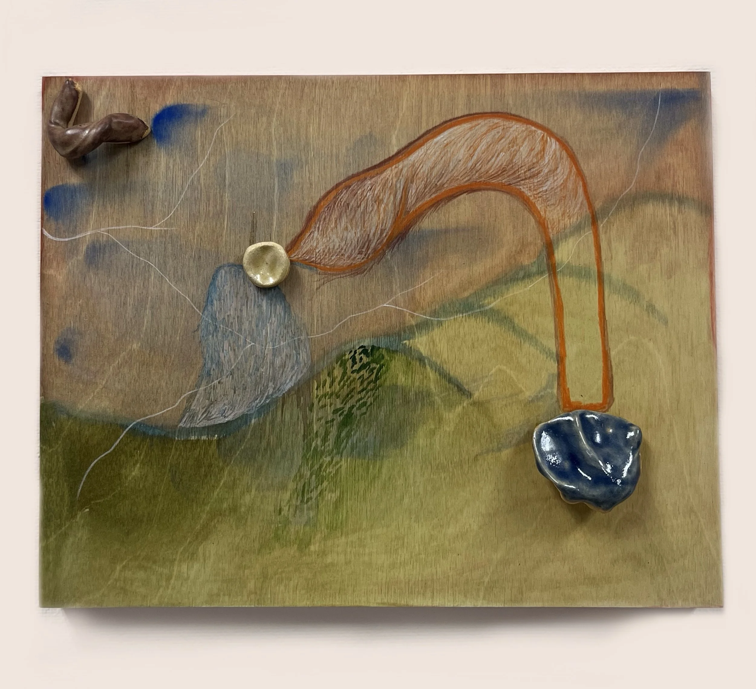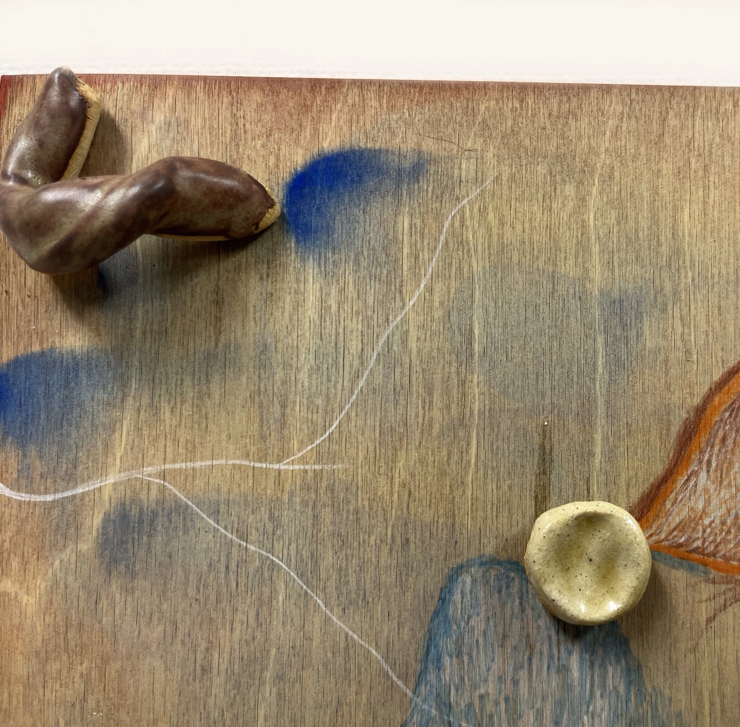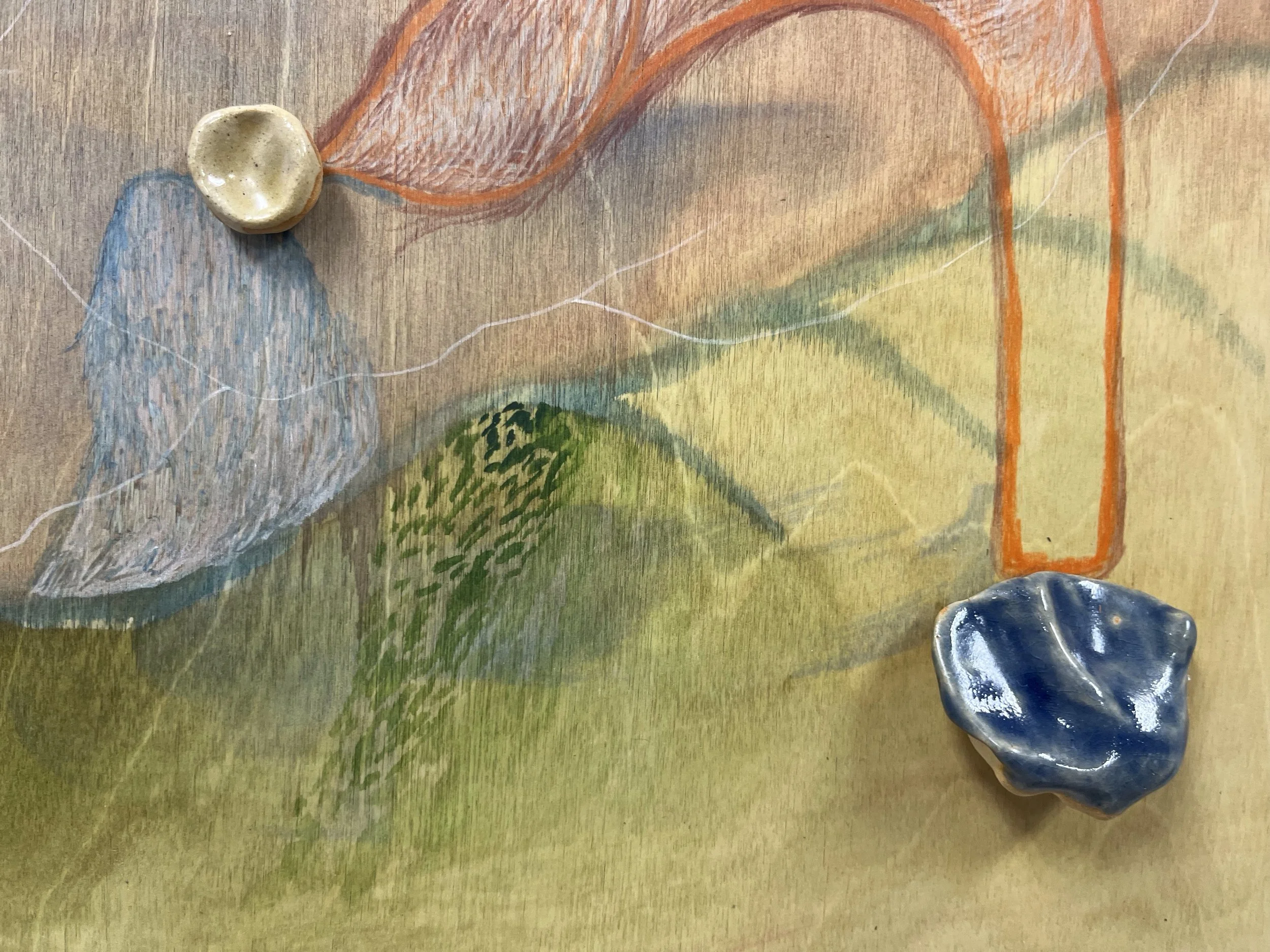 The one that got away | 2024 | ceramic, color pencils and watercolour on wood panel | 14”x11”