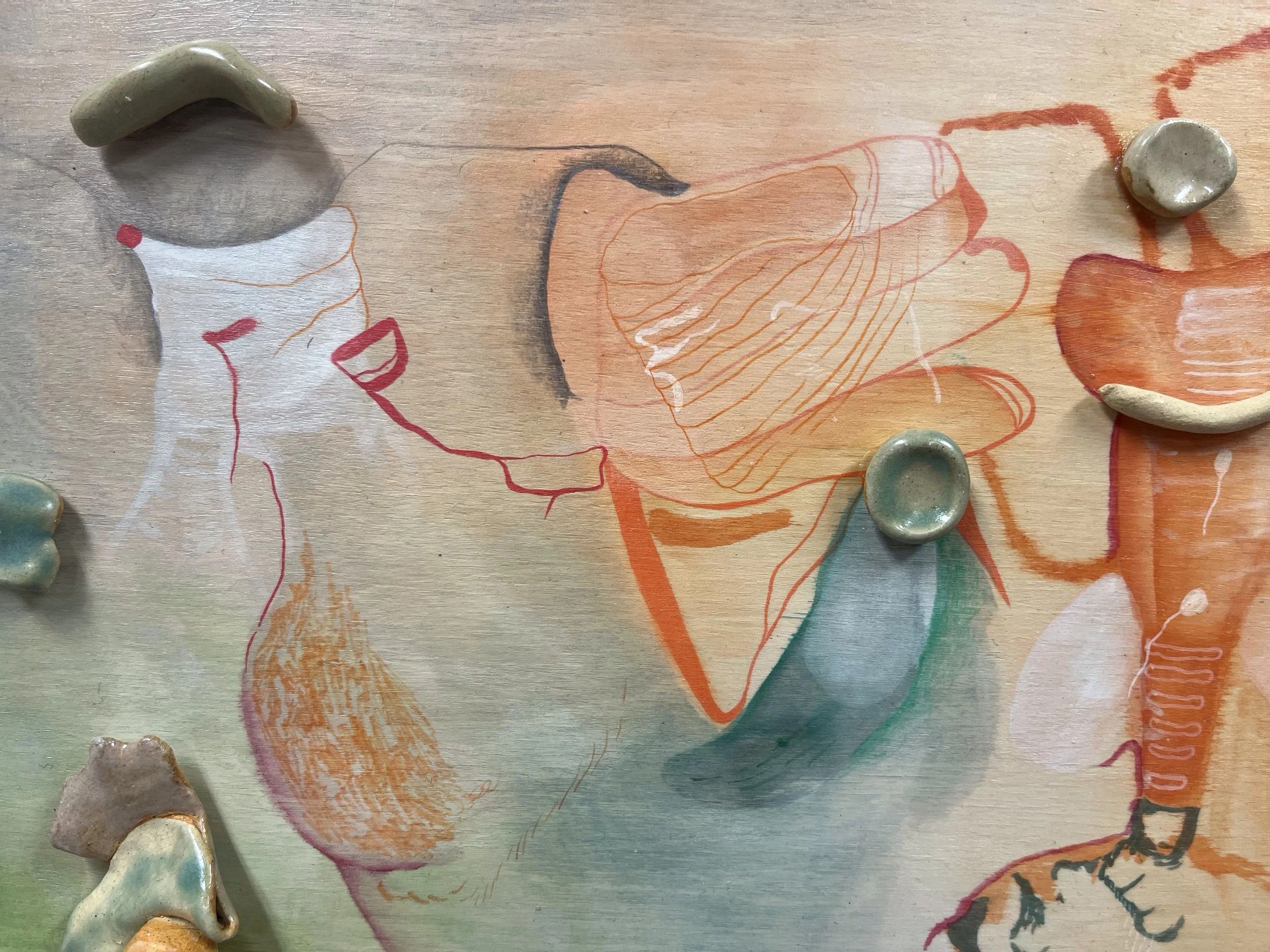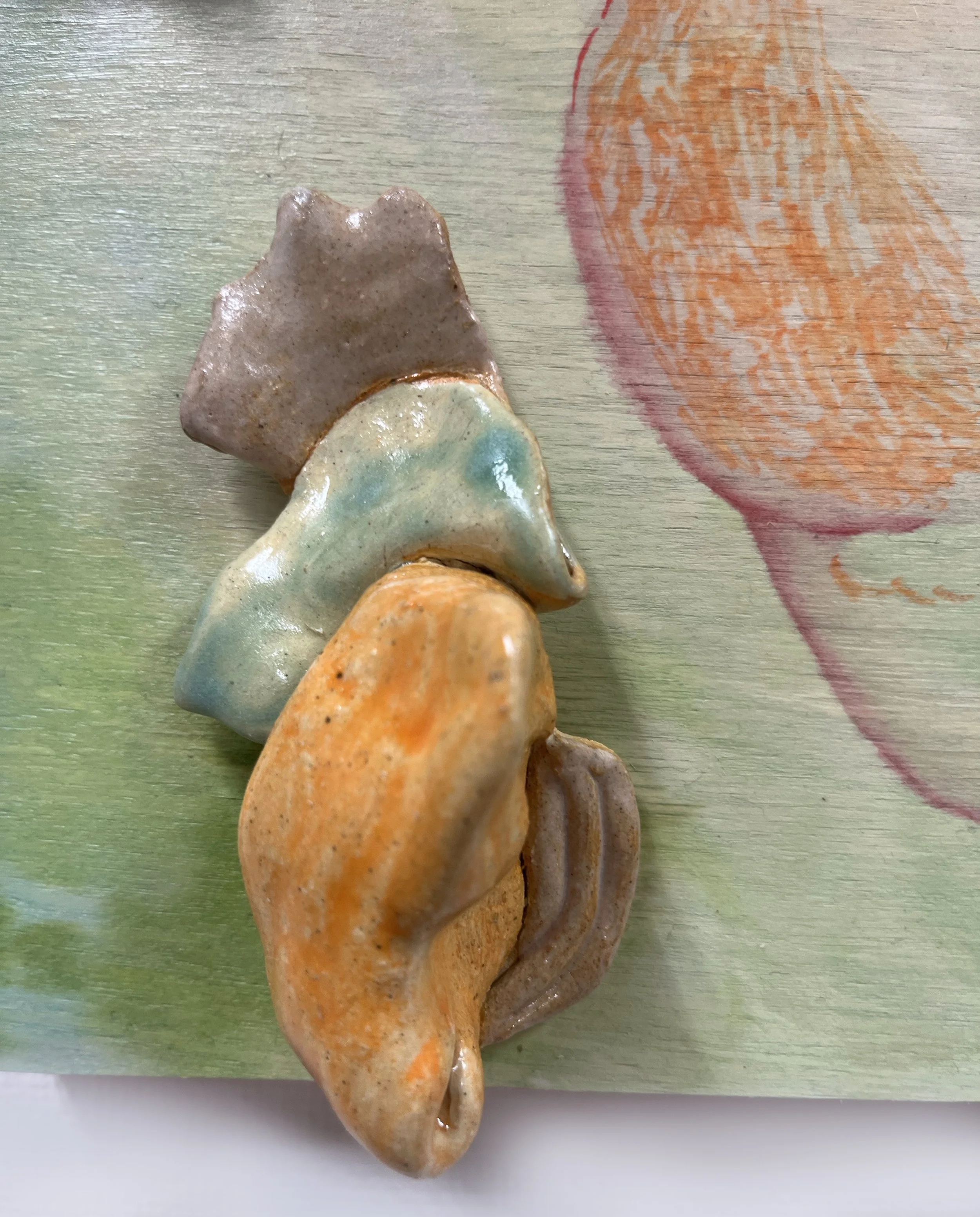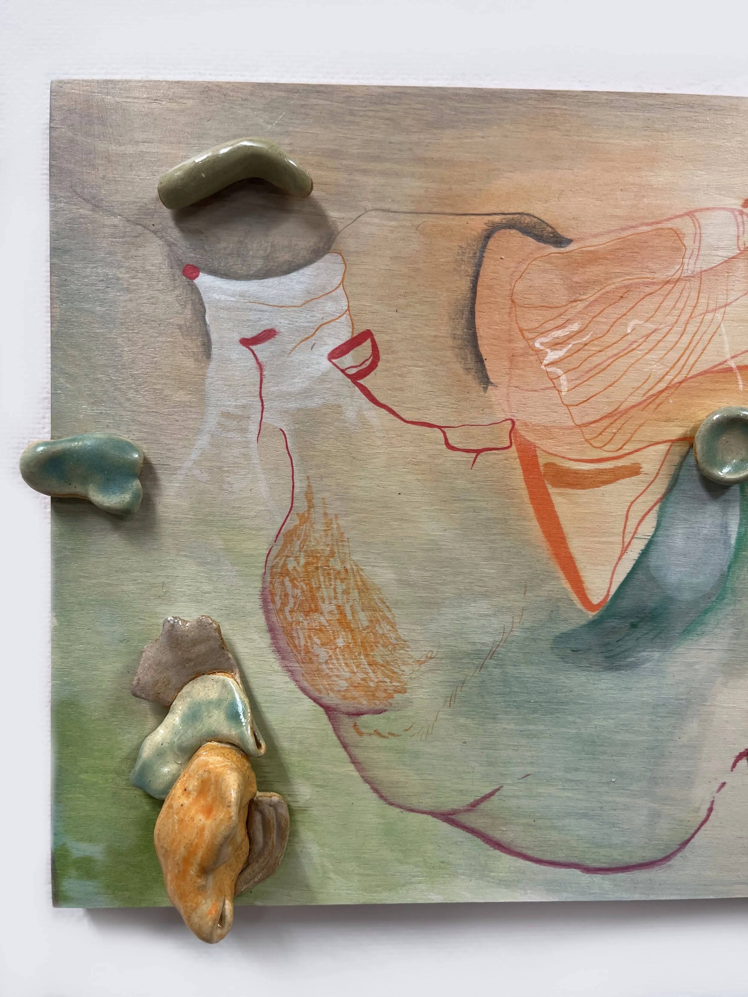 Blow it up| 2024 | ceramic, watercolours, posca markers and color pencils on wood panel | 14”x11”